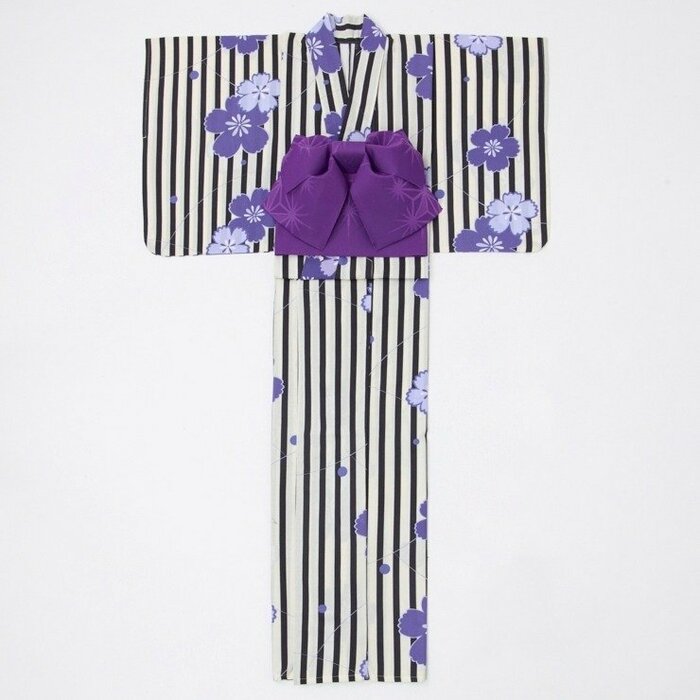 ストライプ地の柄がすらっとした印象を与え、紫色の統一感のある配色と小ぶりの花の柄が可愛くて大人っぽい印象を与えてくれる浴衣です。