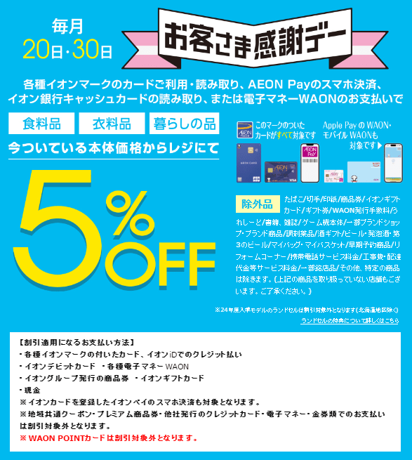 イオンカード会員なら、毎月20日・30日の「お客様感謝デー」で、買い物代金が5%OFFとなります。