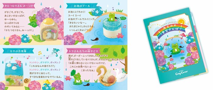 また、ケーキに加え「カエルの夏空さんぽ」の物語を1枚の絵本風リーフレットに。お話とプチケーキがページごとに載っているので、みんなで物語を読みながらそれぞれのケーキを楽しんでもいいですね。