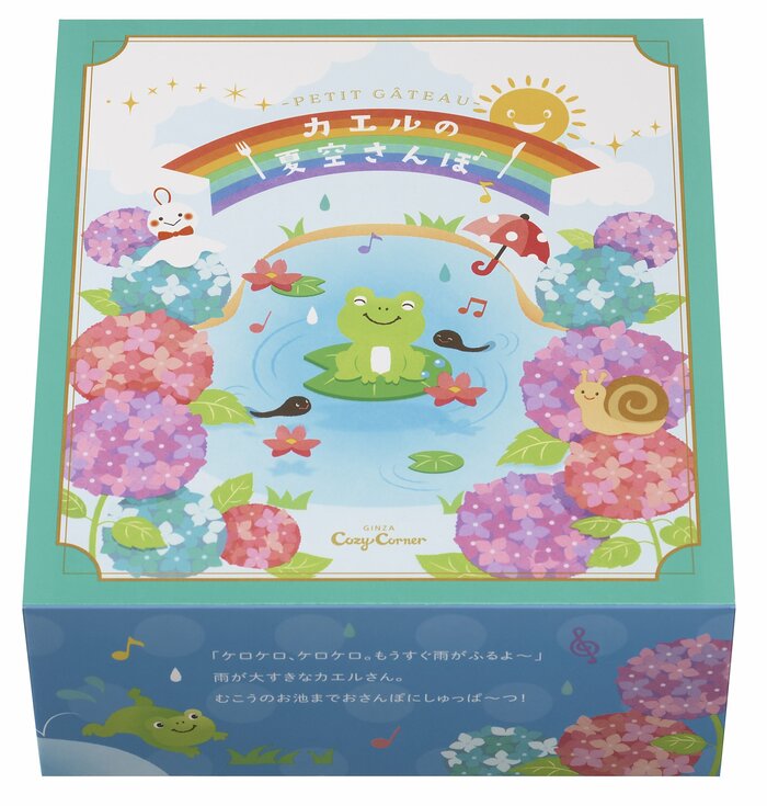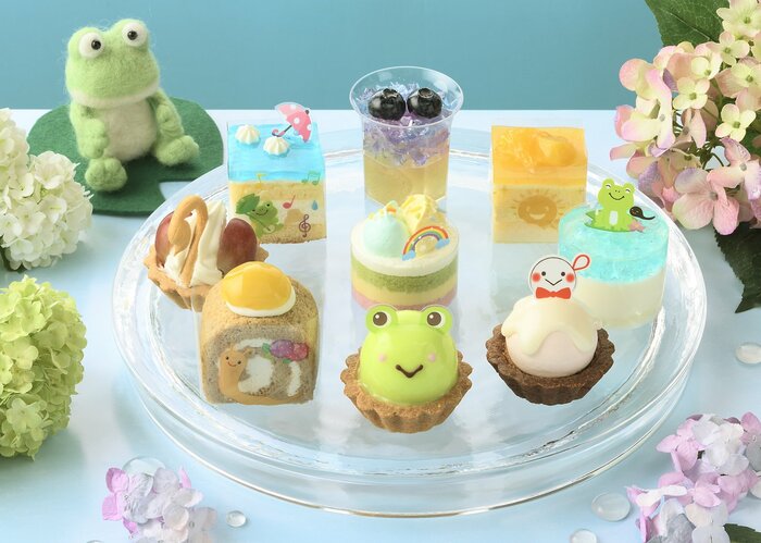 2022年10月に発売された絵本風スイーツ第1弾の『リスの冬じたく』の好評を受けた第2弾となる今回は、カエルさんが楽しく散歩する様子を、季節のフルーツを取り入れた9つのプチケーキで表現。その1つ1つにはストーリーがあり、「雨に濡れてキラキラ輝くあじさい」をぶどうやブルーベリーを使ったゼリーで表現したり、「雨の後に顔を出したおひさま」をマンゴーやオレンジを使ったケーキであらわすなど遊び心満載のデザインとなっています。