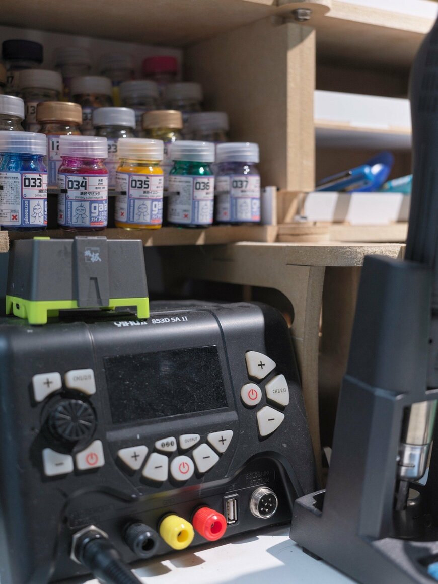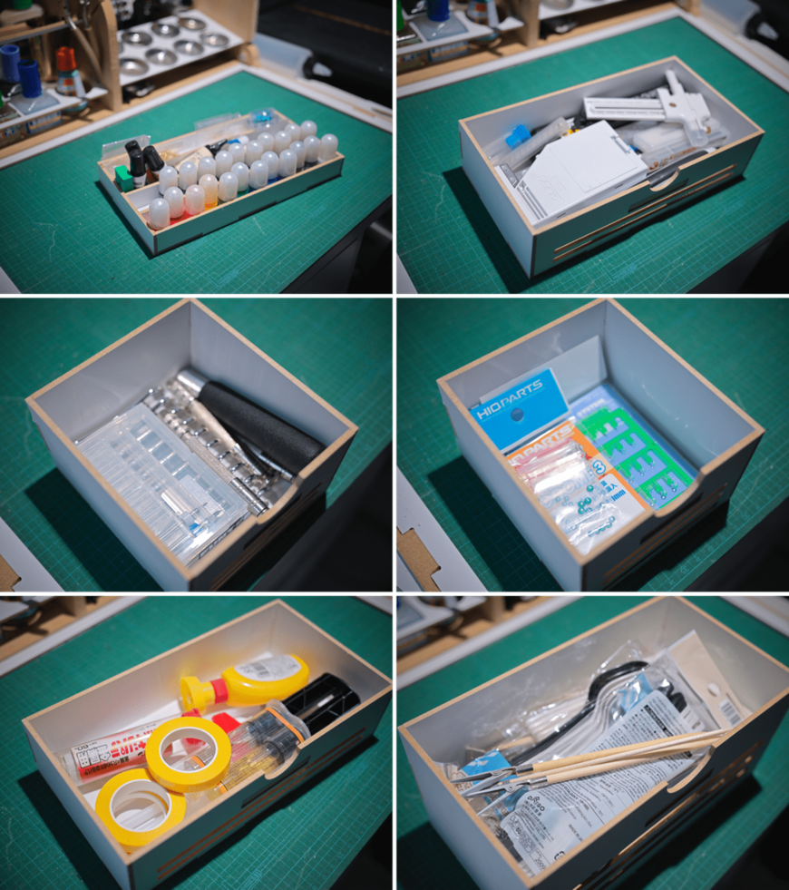 私の場合、電子工作からプラモデル、レジンキャスト、洋裁など道具がいろいろとあるのでジャンルごとに分けて収納したり配置したりしています。