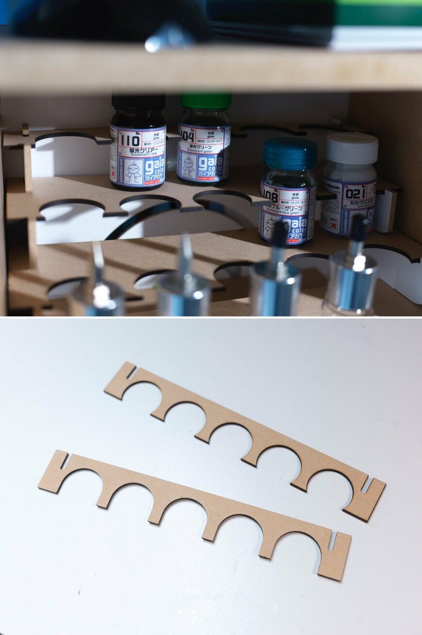 レーザー加工できる方は3mm MDFを使って自分がおきたい塗料瓶サイズを自作してもいいかもしれませんね。もちろんいくつかサイズが付属してくるのでそれを使ってもOKです。