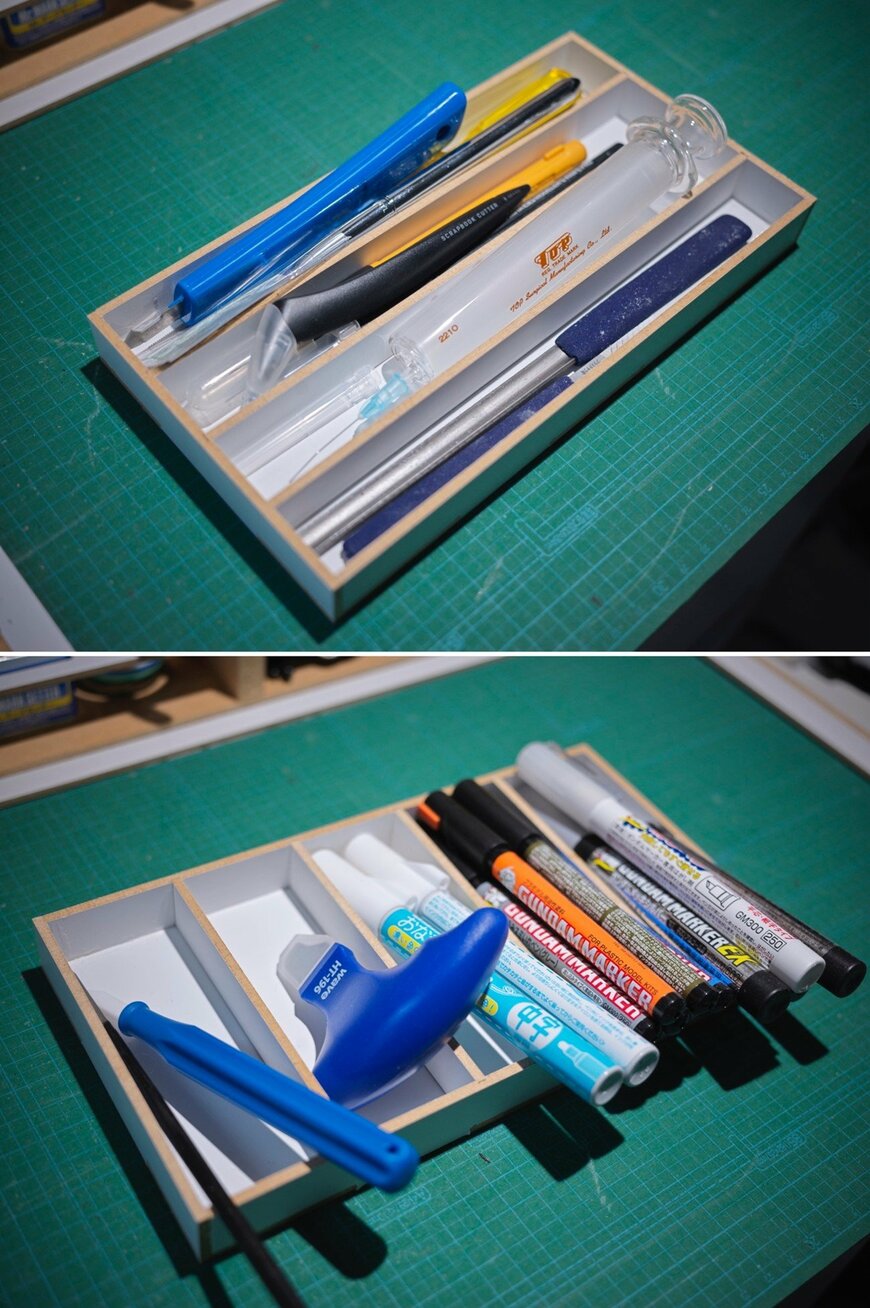 主要なパーツはMDFでできているので、気になる場所は自分好みに加工できるのも便利です。塗料棚の一番奥は取り出しづらかったので形状を変えました。