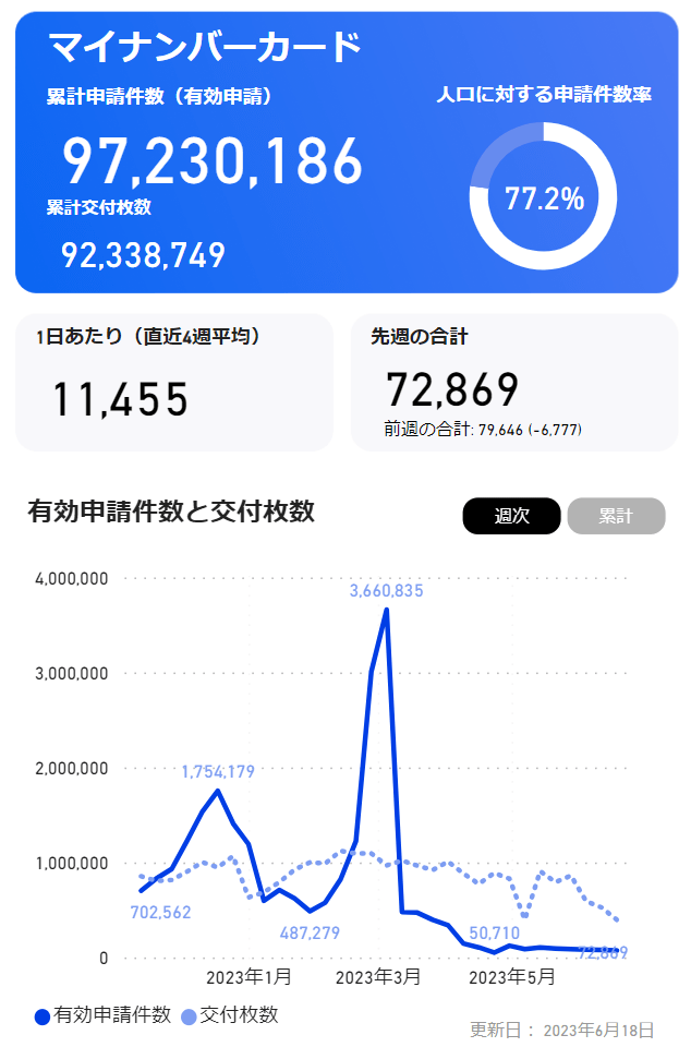 デジタル庁が2023年6月23日に発表した政策ダッシュボードによると、6月18日時点のマイナンバーカードの累計申請件数(有効申請)は9723万186件、累計交付数は9233万8749件。人口に対する申請件数率は77.2%。1日あたりの申請件数は1万1455件(直近4週平均)。先週の申請合計件数は7万2869件で、前週から6777件減でした。
