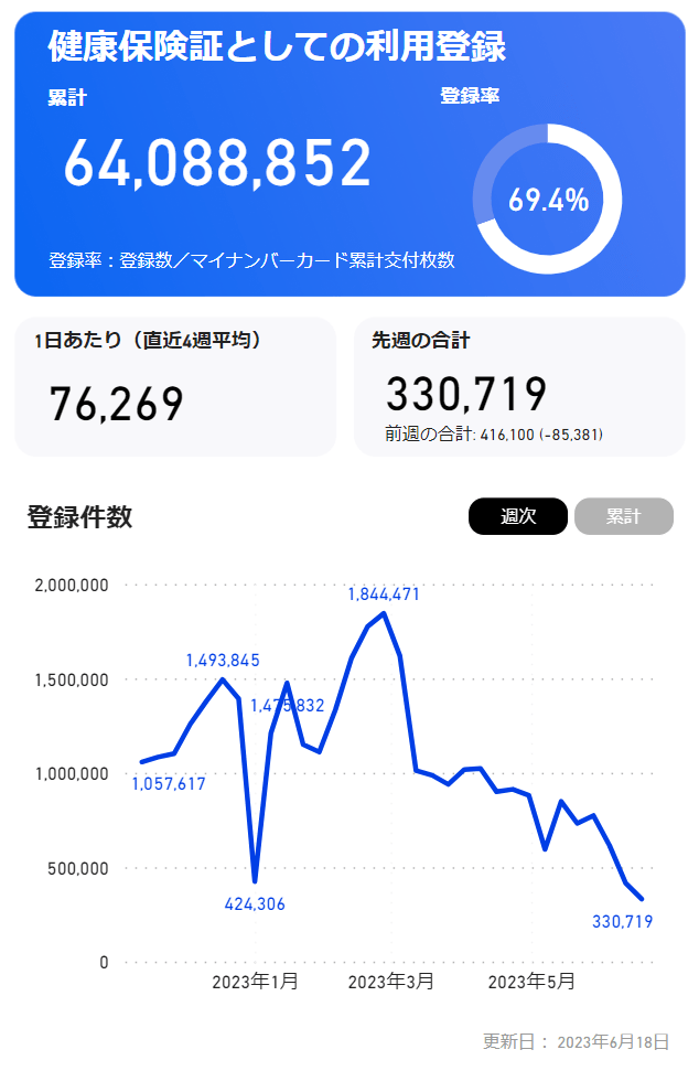 健康保険証の累計登録件数は6408万8852件。登録率は69.4%。1日あたりの登録件数は7万6269件(直近4週平均)。先週の申請合計件数は33万719件で、前週から8万5381件減でした。