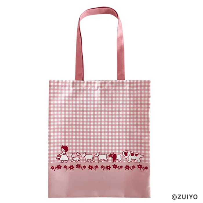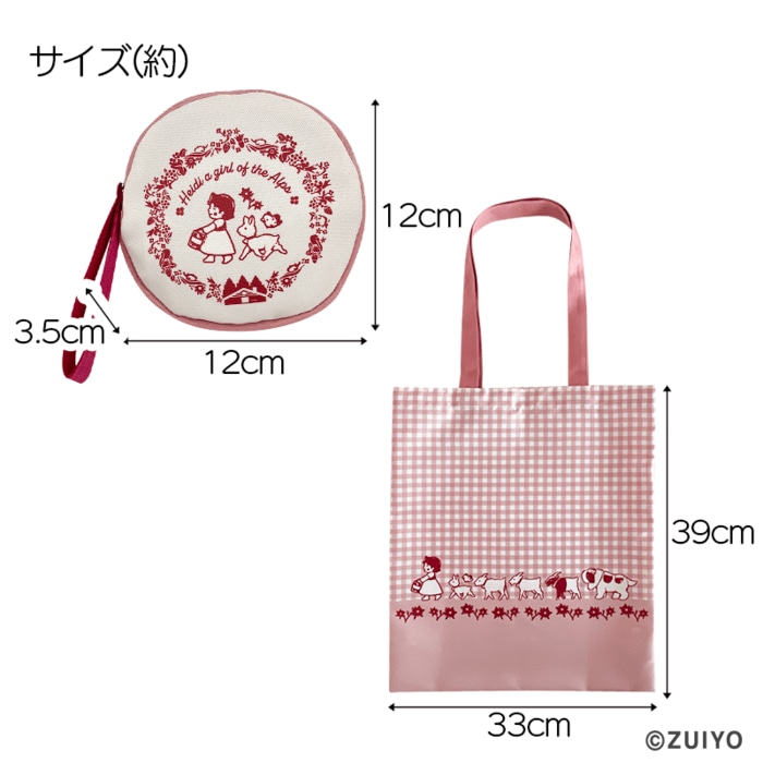 『アルプスの少女ハイジ』のエンディング曲「まっててごらん」の絵柄がプリントされた、A4サイズが入る赤いチェック柄のトートバッグです。サブバッグとしても活躍してくれそうなサイズ感ですね。バッグが収納できるうれしいミニポーチ付きです。