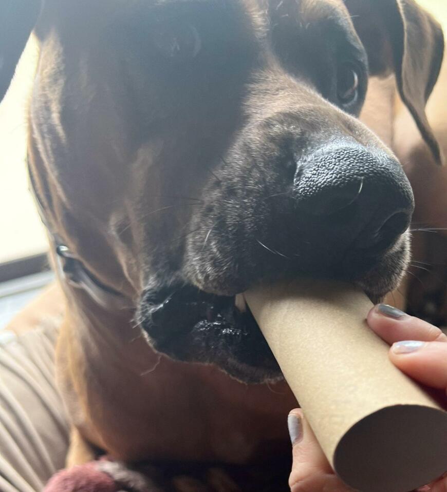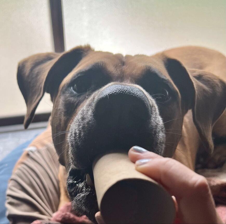 一方、ワンちゃんの反応はというと……?3枚目の写真には、トイレットペーパーの芯にガブッとかぶりつく姿がおさめられています。「おもちゃかな?とりあえず噛んでみよう」なんて具合のリアクションが愛らしいです。