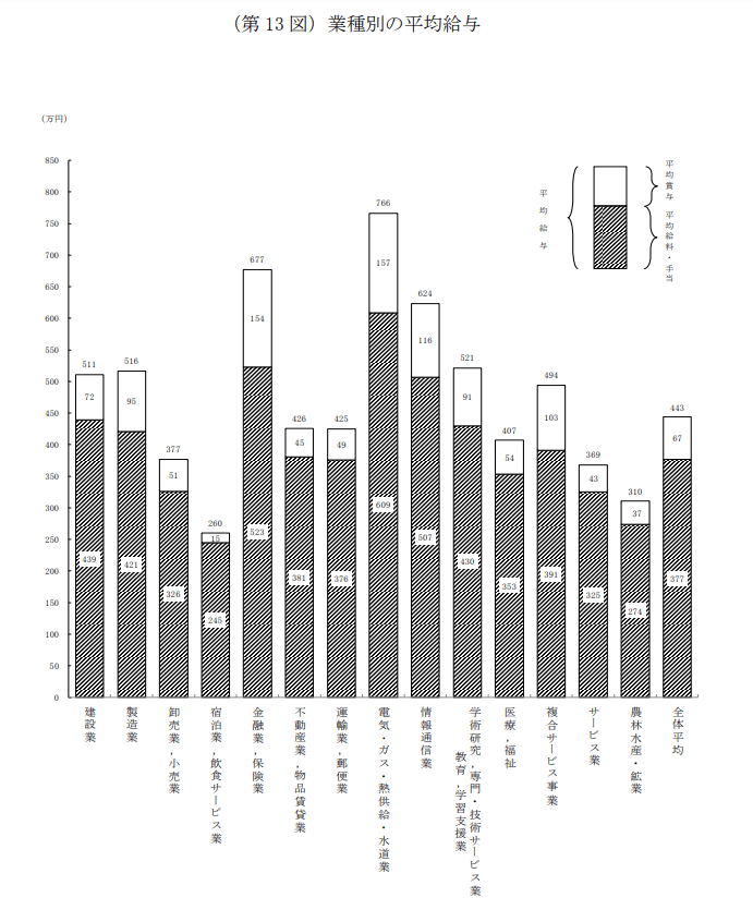 全体の平均年収は443万円ですが、「電気・ガス・熱供給・水道業」の平均は766万円。