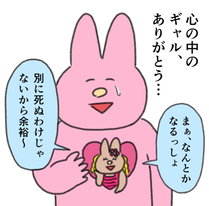 ツラいことがあり心が弱っているウサギは、ホロリと涙を流しています。そんなウサギの心から顔を出しているギャルウサギは、「なんとかなるっしょ」とあっけらかんな様子。心の中にこんなギャルがいれば、悩み事なんか吹き飛ばしてしまえそうですね。