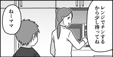 「レンジでチンするから少し待ってね」と、ご飯の用意をする様子の母。しかし、この母の一言をきっかけにしてなぜなぜ期の息子に火がついてしまいます。