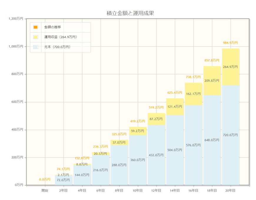 仮に「月3万円・年利5%・20年間」で運用できた場合には約1233万円(うち元本720万円・利益約513万円)となります。