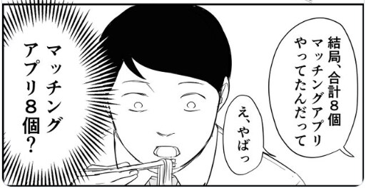 次の瞬間、「マッチングアプリ8個やってたんだって」の一言に驚いてしまい、ラーメンを食べる箸が止まってしまいます。1つでもやりとりが大変そうなのに、8個とはどのように使いこなしているのか気になってしまいますね。