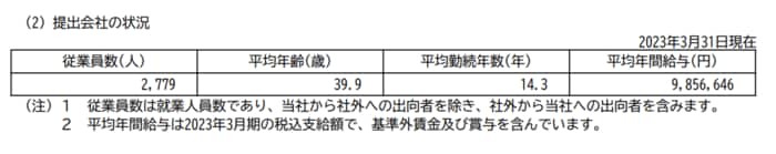 任天堂(提出会社)の2023年3月末時点での従業員数、平均年齢、平均勤続年数および平均年間給与は以下の通りです。