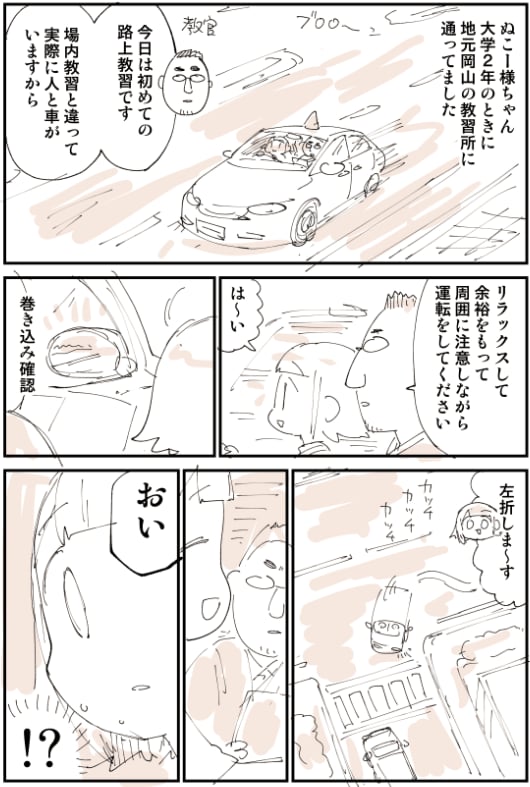 大学2年生のぬこー様ちゃんさんは、免許を取るために教習所に通っていました。この日は初めての路上教習。にこやかに始まったかのように思われましたが、出発後すぐに事件は起こります…。