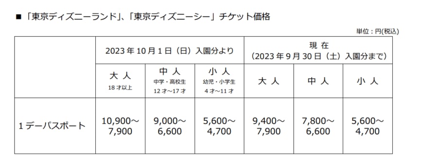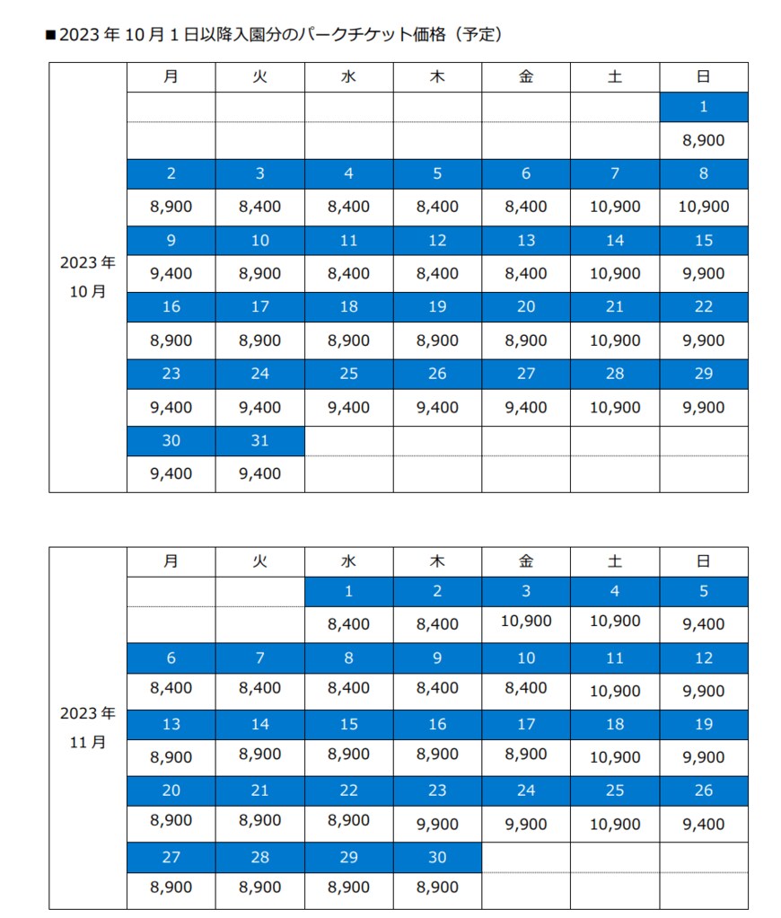まずは2023年10月1日入園分からのパークチケット価格を確認しましょう。