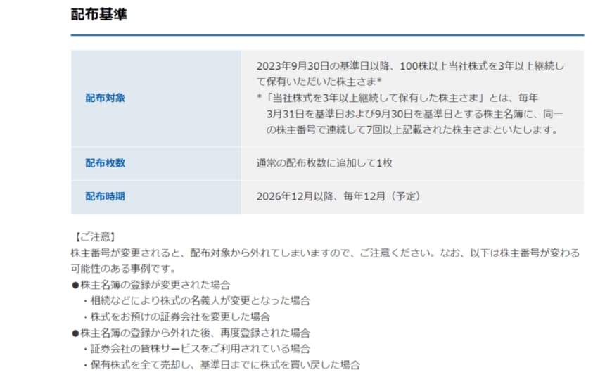 - 配布対象:2023年9月30日の基準日以降、100株以上の株式を3年以上継続して保有した株主(毎年3月31日と9月30日を基準日とする株主名簿に同一の株主番号で連続して7回以上記載)