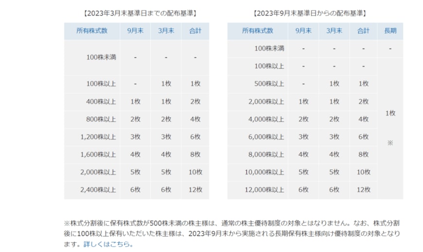 ただし、株式分割後に100株以上保有した株主の場合、2023年9月末から実施される長期保有株主様向け優待制度の対象となります。