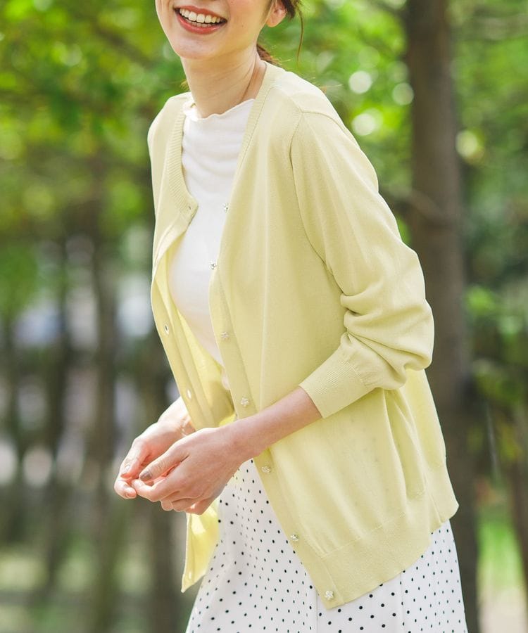 紫外線をしっかりカットしながら、さらりとした着心地が嬉しい「8分袖変わり釦カーデ」。素材は、環境に優しいリサイクルレーヨン混素材を使用しており、肌に触れた瞬間冷たく感じる接触冷感機能付き。暑い夏でも快適な着心地で過ごすことができそうです。