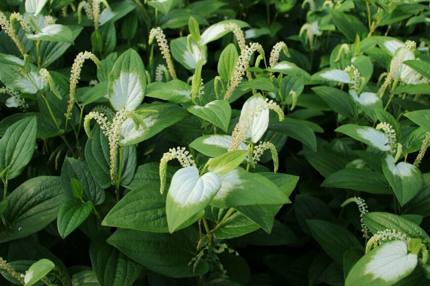 ハンゲショウは水辺や湿地を好む多年草。6~7月にかけて花穂を開き、すぐ下の葉が半分白くなります。お化粧をしたように白く色付いた葉が、雨の庭で明るく輝くようです。※参考価格:700~1000円前後(3号ポット苗)