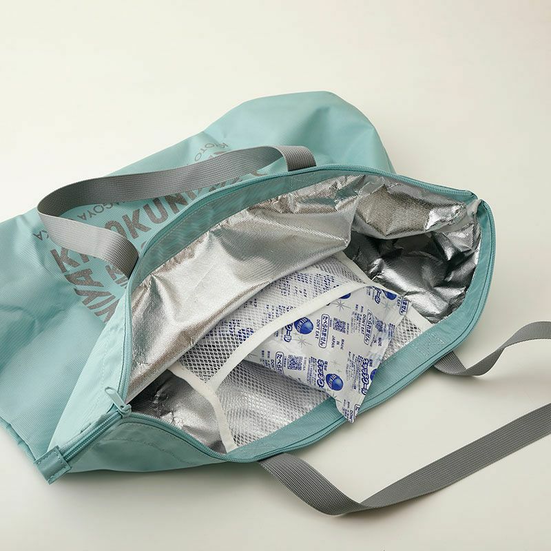 付属のゴムでコンパクトにまとまる保冷バッグは、毎日持ち歩くのに便利なサイズ感。裏地には保冷剤が入れられるメッシュの内ポケットが付いており、飲食物の鮮度を保つのに一役買っています。肩掛けも可能な52cmの持ち手が便利なトートバッグ型です。