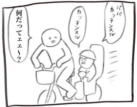 「@inu_eat_inu」さんが運転する自転車の後ろに、2歳の息子ちょーちゃんが乗っています。するとちょーちゃんが「カッチンスル」と言いだし、何やらパパに伝えようとしてきました。