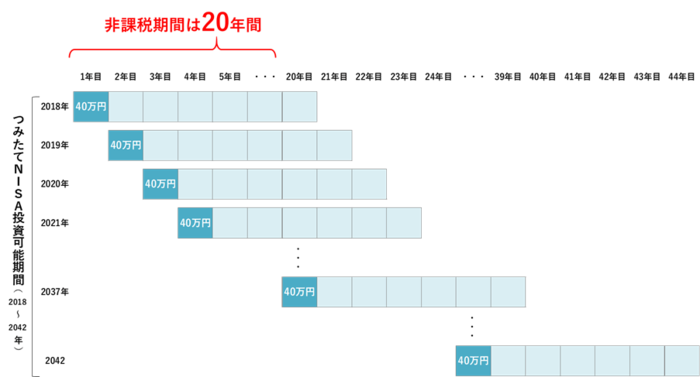 たとえば、つみたてNISAであれば年間40万円を上限として対象の投資信託から得られる利益が最大20年間非課税となります。