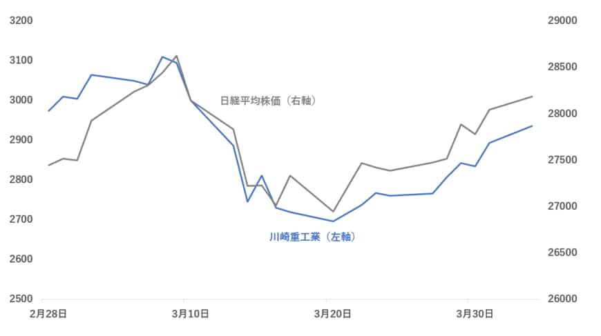 市場下落の影響が一巡したのちは、川崎重工業の業績や市況に注目が移り、株価は反発したと思われます。