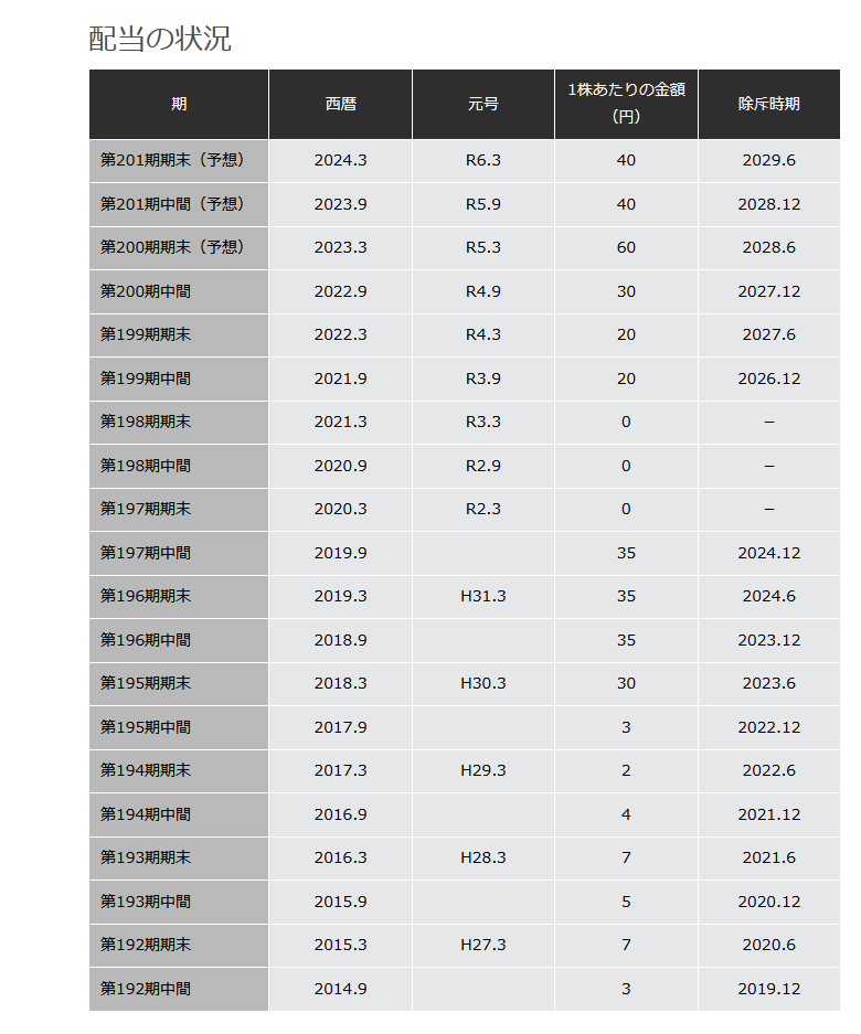 川崎重工業はコロナ禍の2020年3月~2021年3月にかけて無配が続いていましたが、2021年9月から復配して1株当たり20円でした。