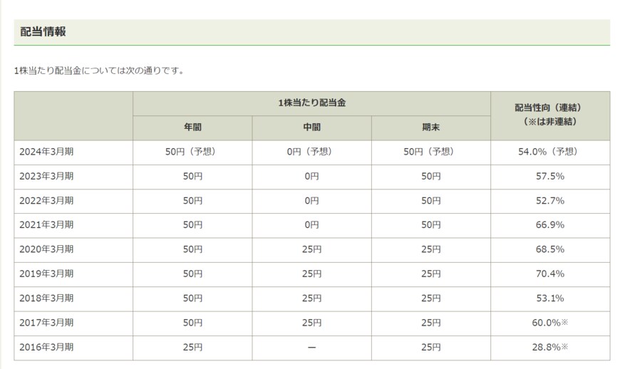 ゆうちょ銀行の配当金は安定しており、年間計50円という状態が2017年3月期以来続いています。