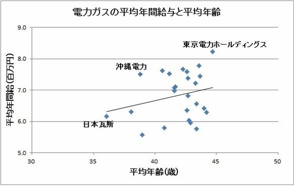 また、各社の従業員数で加重平均した平均年齢は43歳で、平均年収は720万円です。加重平均での平均年収が高めに出ているのは、東京電力ホールディングス、中部電力などの寄与によるものです。