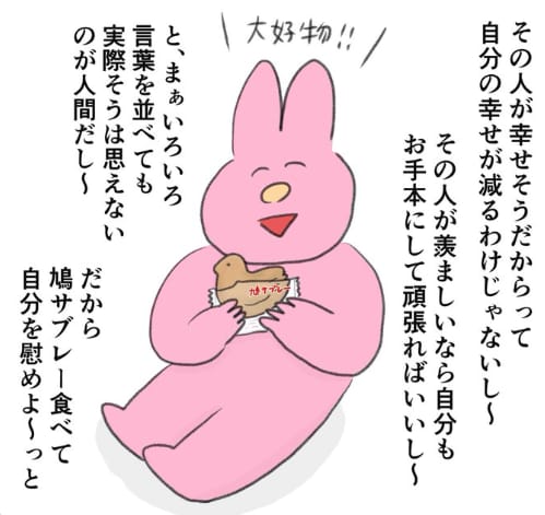 描かれているのは、鳩サブレーを食べながら自分を冷静に見つめるウサギ。うらやましさや嫉妬に駆られる自分に、「他人が幸せだからって自分の幸せが減るわけではない」「人をうらやましがるならお手本にして頑張ればいい」とポジティブな言葉を伝えています。