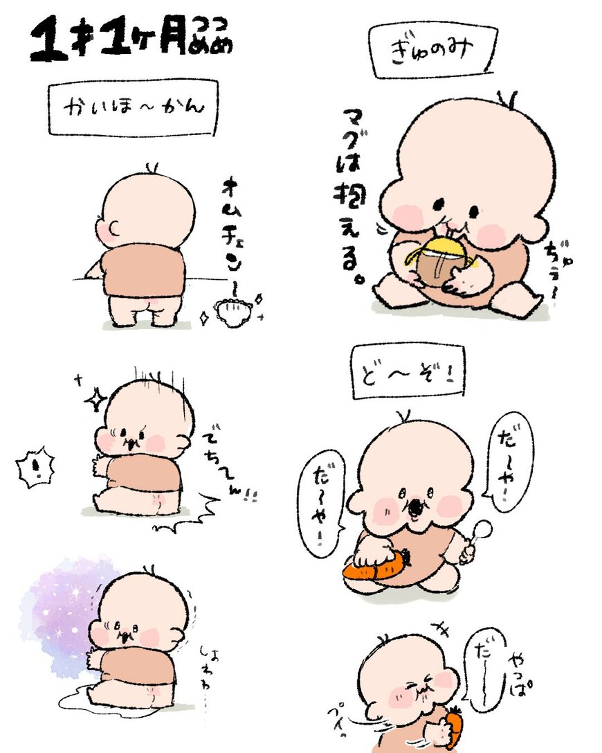 「つめつめ。」というコメントとともに投稿されたのは、1歳1ヶ月になる我が子のかわいらしい仕草をまとめた1枚のイラストでした。