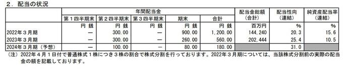商船三井の株式を1年前に買い、持ち続けたとすると、「2023年3月期の中間配当」と「2023年3月期の期末配当」の計2回を受け取ることができます。