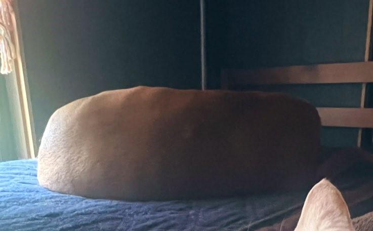 猫ちゃんのモフモフした後頭部に加え、視線を惹くのはワンちゃんの後ろ姿。茶色のボディをくるっと丸めて、四角のフォルムになっています。なんだか「パンやお饅頭」といった美味しそうな食べ物を連想してしまう佇まいが愛らしいです……!