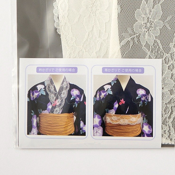 写真のように、衿もとや帯にプラスして活用します。アンティーク調花柄のレースが愛らしい雰囲気を演出してくれます。