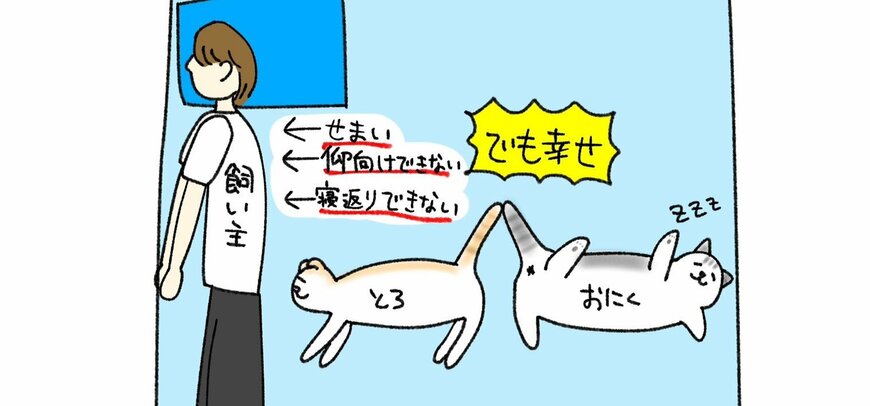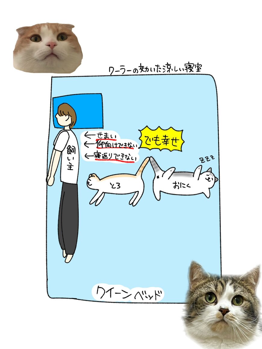 投稿画像には、寝室で眠る際の飼い主さんと猫ちゃんのようすを描いたイラストと、一緒に暮らす「とろ」くん(左上)と「おにく」くん(右下)の写真がおさめられています。