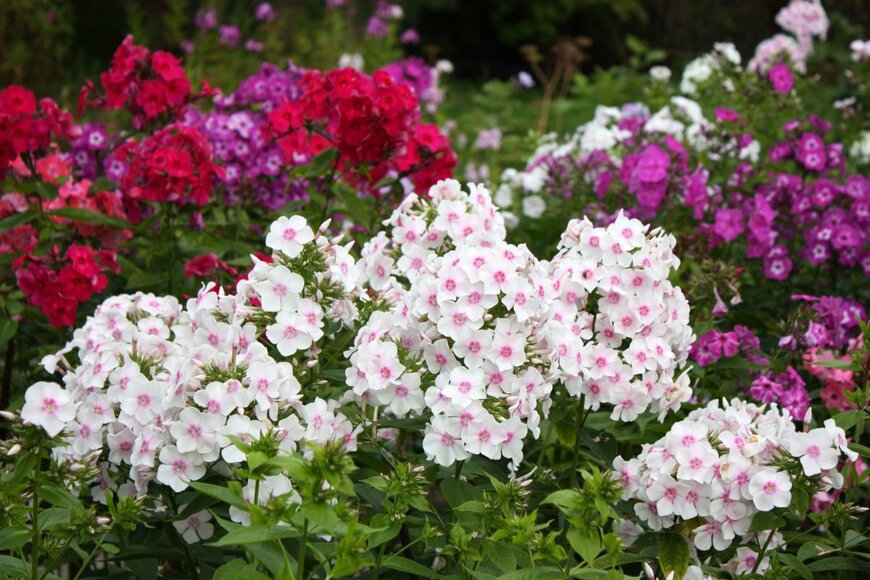 品種や花色のバリエーションが豊富な宿根フロックス。2~3センチの小花が集まって、豪華な房状の花になります。背丈が高くスタイリッシュな草姿で、庭の主役としてオススメです。※参考価格:300~700円前後(3号ポット)