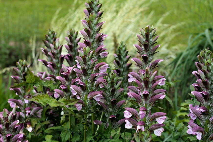 大型の花がインパクト抜群のアカンサス。1メートルほどの高さまで穂状の花を立ち上げます。深い切れ込みが入る葉もキレイで、半日陰の庭でも栽培可能です。※参考価格:500~800円前後(3号ポット苗)