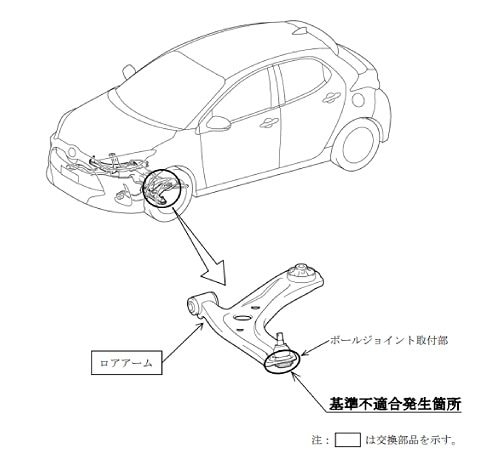 - 対応方法:全車両、左右ロアアームを点検し、亀裂が生じているものは良品と交換する