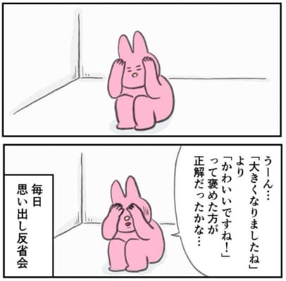 一人で頭を抱え、「可愛いって褒めた方が正解だったのかな…?」と、会話の正解を探して思い悩んでいたのでした。言われた側はあまり気にしていなくても、繊細な人にとっては「気に障ったかな?」と気にしてしまいがち。