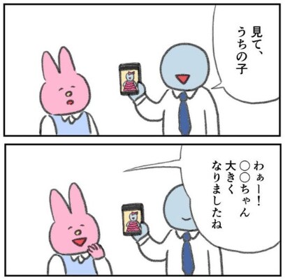 描かれていたのは、会社で働いているウサギ。同僚の子どもの写真を見て、「大きくなりましたね!」とごく一般的な返事をしますが、帰宅後なにやら様子が変です…。