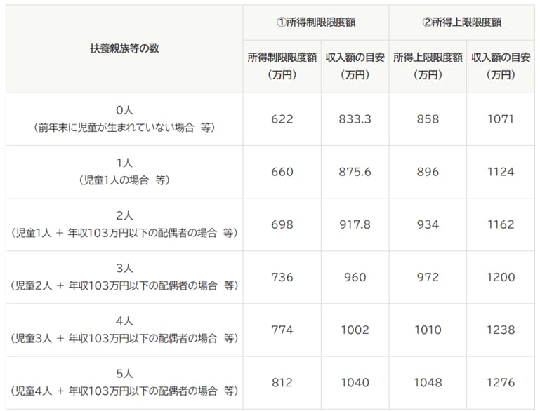 所得制限を受ける具体的な年収の目安は、子どもの人数や配偶者の年収などにより下表のように異なります。