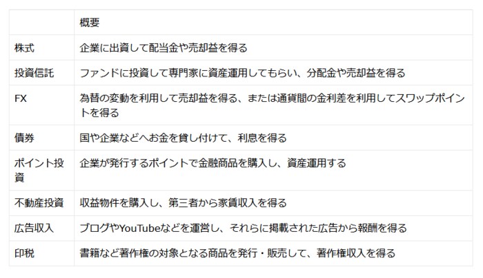 月10万円の不労所得を得る方法について、具体例を以下の表にまとめました。