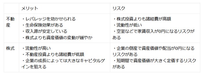 リスクの高さは投資対象となる物件や株式の銘柄によって個別に異なるため、物件や銘柄の選定が重要になります。