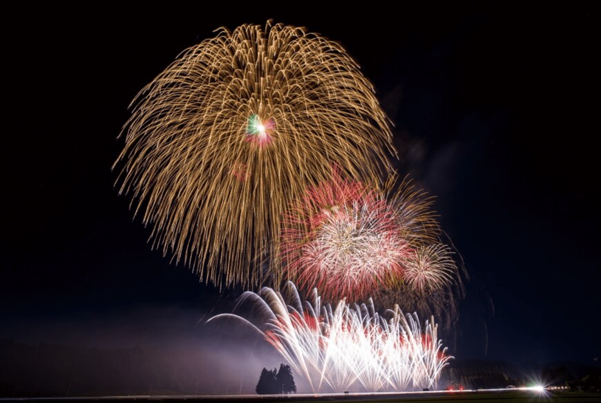 花火の名所といわれる秋田県大仙市で開催される花火大会。30数年前に復活した天王まつりに、地元の有志が花火を10発ずつ持ち寄ったのがはじまりと言われています。全国では珍しい女性花火師の競技大会が行われるのも見どころ。
