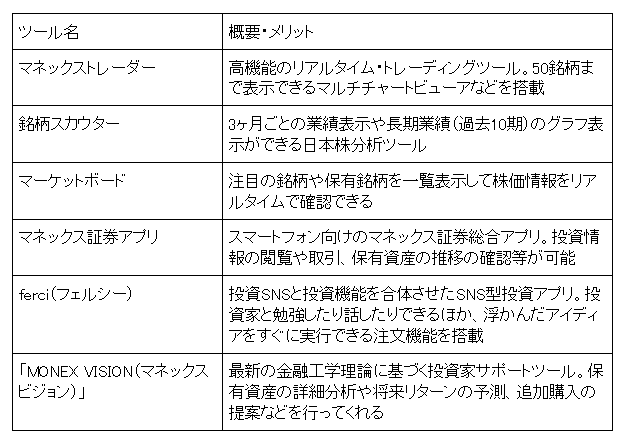 マネックス証券では以下のようなツールを投資家向けに提供しています。