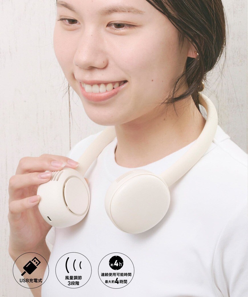 カラーもシンプルなホワイトなので、どんな服装にもマッチしやすいでしょう。USB充電タイプで最長約4時間使用でき、ファンが髪の毛を巻き込みにくい設計なので、料理中や運動時にも安心して使用できます。