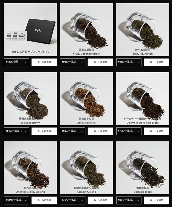 teploの公式茶葉はお茶好きのteploスタッフが1つ1つ飲み比べて吟味して探したもの。飛び抜けて変わったものはありませんが、お茶のラインナップ同士が似通わないように個性があるものが選ばれています。