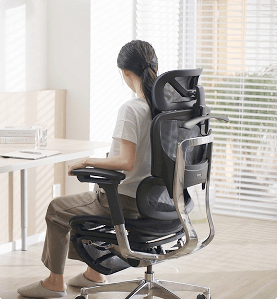 - フットレストは伸ばして使う以外にそっとふくらはぎあたりを支えるようにも使える。メッシュが柔らかいので自然に支えてくれるので長時間使用でも足が疲れにくい。