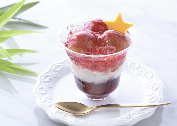 芳醇なぶどうのおいしさを爽やかに味わえるゼリー仕立てのデザートです。すっきりとした味わいのぶどうゼリーと、やさしい甘さのミルクゼリーを重ね、クラッシュゼリーとぶどうをトッピングしています。みずみずしく夏にぴったり。トッピングの星型のチョコは七夕限定です。